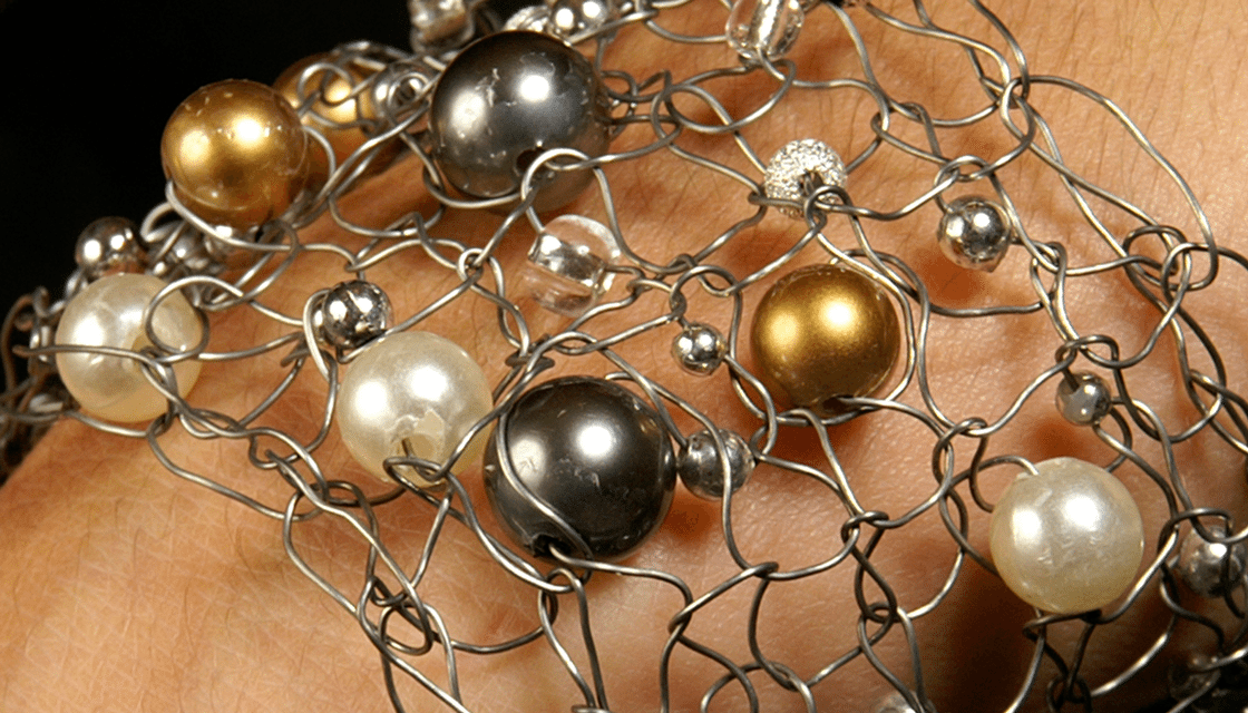 Description des œuvres : Écharpe magique © et bracelet sur fil de cuivre ©