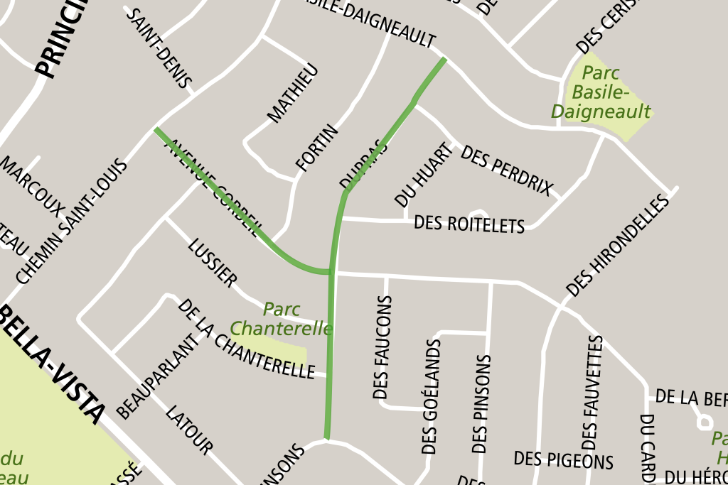 Les travaux de pavage palliatif sur les rues Dupras (entre les rues Lussier et Basile‑Daigneault) et Corbeil (entre la rue Dupras et le chemin Saint-Louis), ainsi que l’installation des balises permettant de sécuriser le corridor scolaire de la rue Dupras sont terminés.
