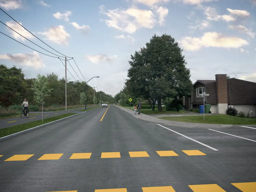 De plus, en raison de la présence d’un cours d’eau et de maisons du côté nord du rang des Vingt, la Ville a opté pour une piste multifonctionnelle, réduisant ainsi l’élargissement de la chaussée et minimisant notre impact sur le cours d’eau et les terrains privés. L’intersection de la rue de la Montagne est sécurisée par des panneaux d’arrêt, ce qui permettra un raccordement sécuritaire entre la piste cyclable du côté nord (rue Taillon Ouest à la rue de la Montagne) et la piste multifonctionnelle du côté sud (rue de la Montagne à la rue de l’Îlot-du-Coteau).